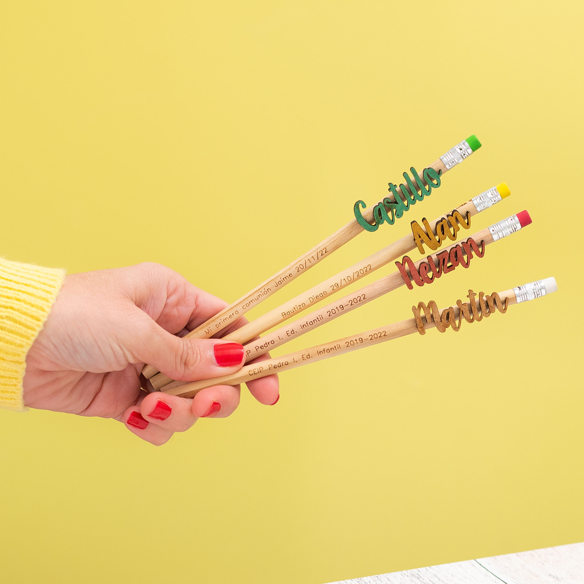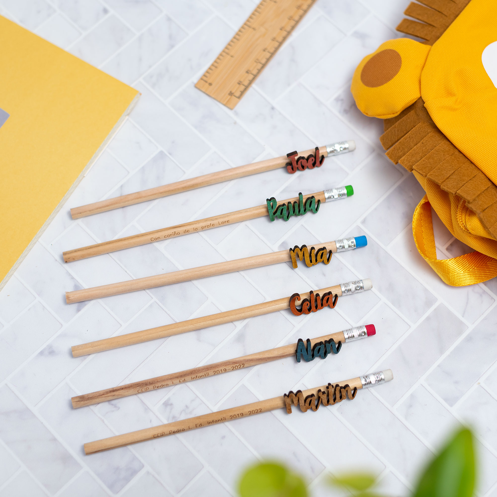 Los lápices tradicionales personalizados con tu propio nombre, con casquillo de gomas de colores, como los de toda la vida…
