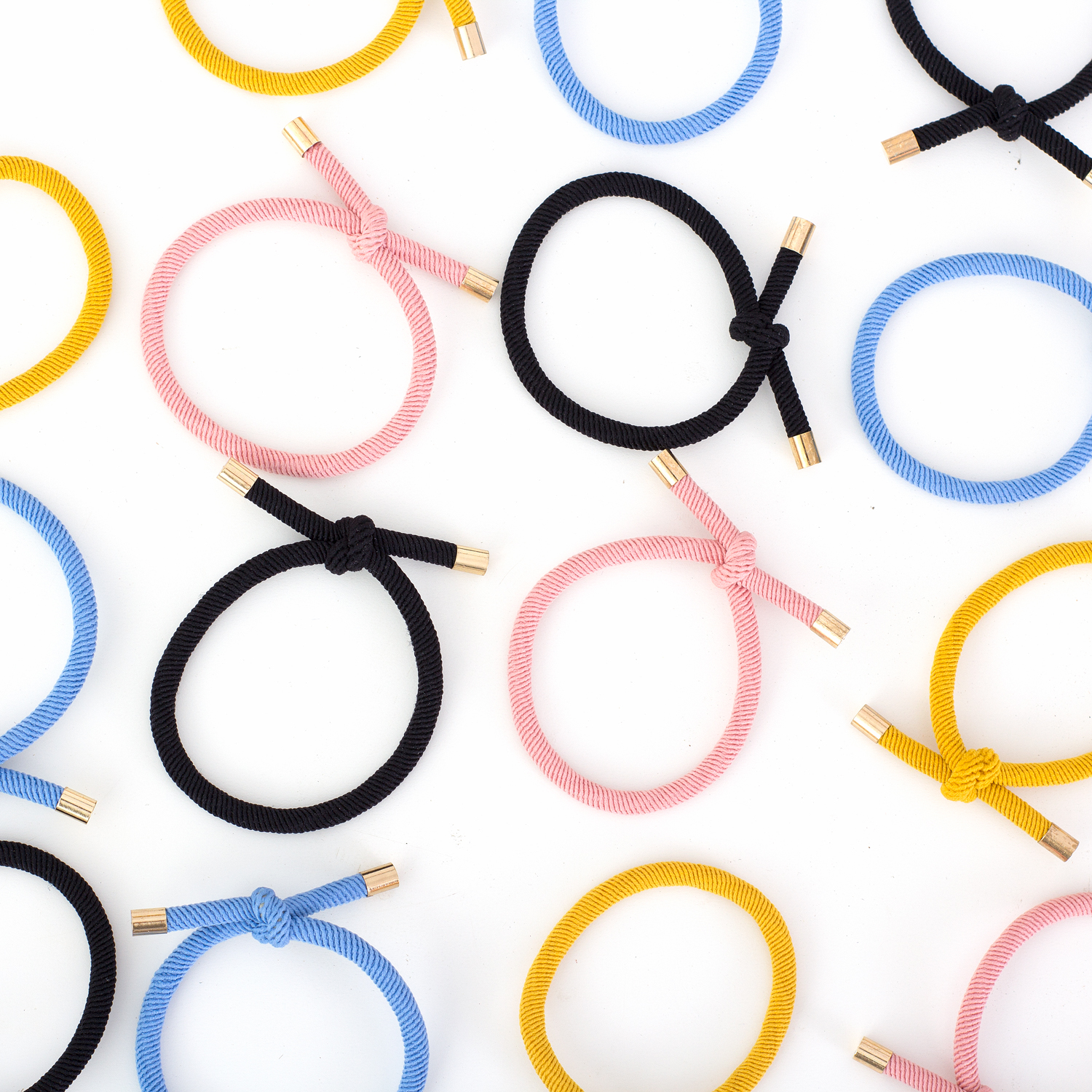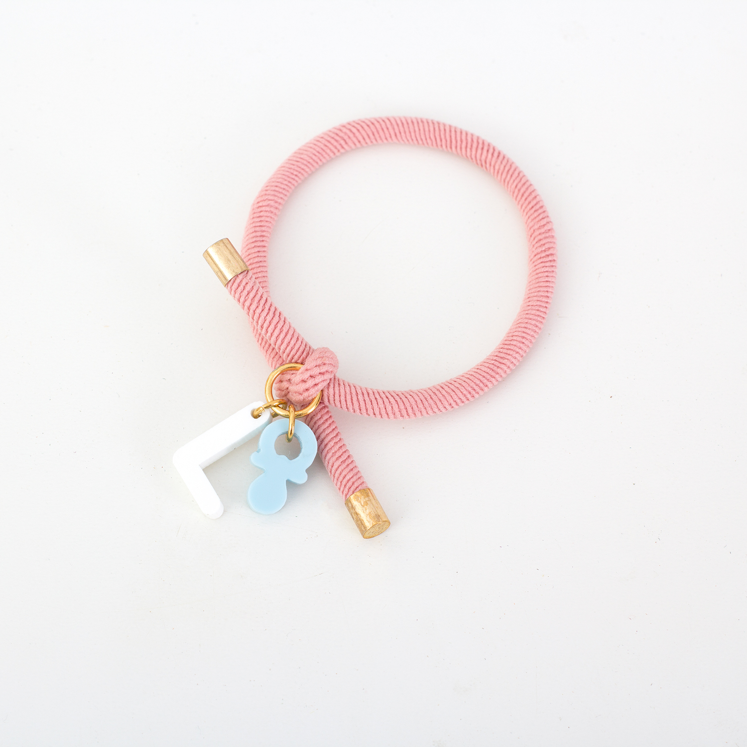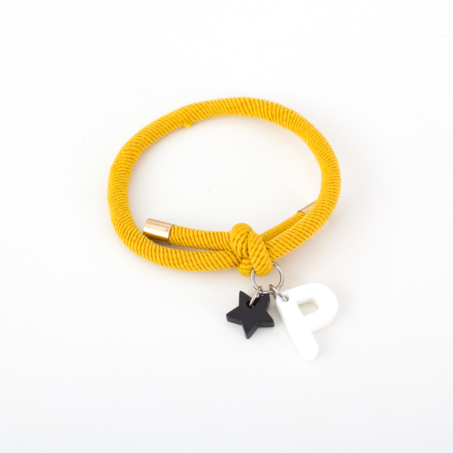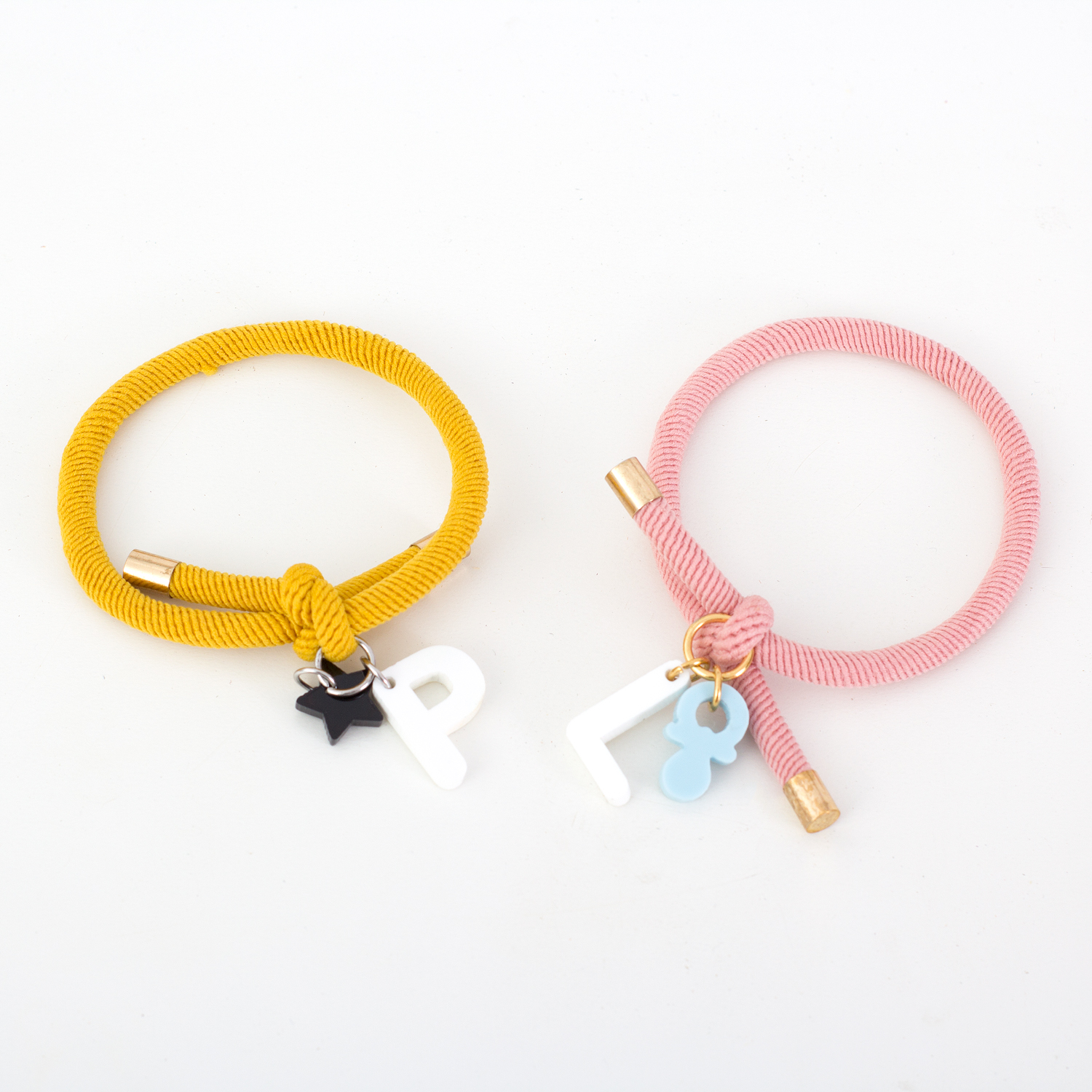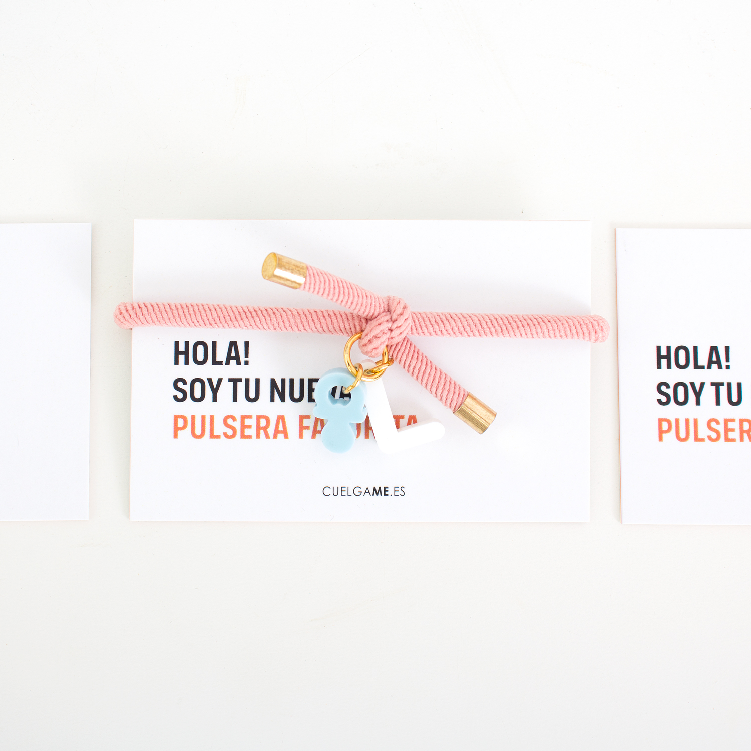 Material: pulsera de goma elástica con terminaciones de acero inoxidable en color dorado e iniciales en  metacrilato de colores de espesor 3 mm.